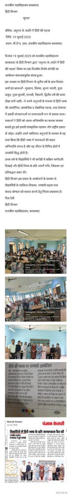 हिन्दी केवल एक भाषा नहीं, बल्कि भारतीय संस्कृति, संवेदना और आत्मा की अभिव्यक्ति का माध्यम है। राजकीय महाविद्यालय सरकाघाट के हिन्दी विभाग का उद्देश्य विद्यार्थियों को न केवल साहित्यिक दृष्टि से समृद्ध करना है, बल्कि उन्हें समाज के प्रति उत्तरदायी, संवेदनशील और विवेकशील नागरिक के रूप में तैयार करना भी है।